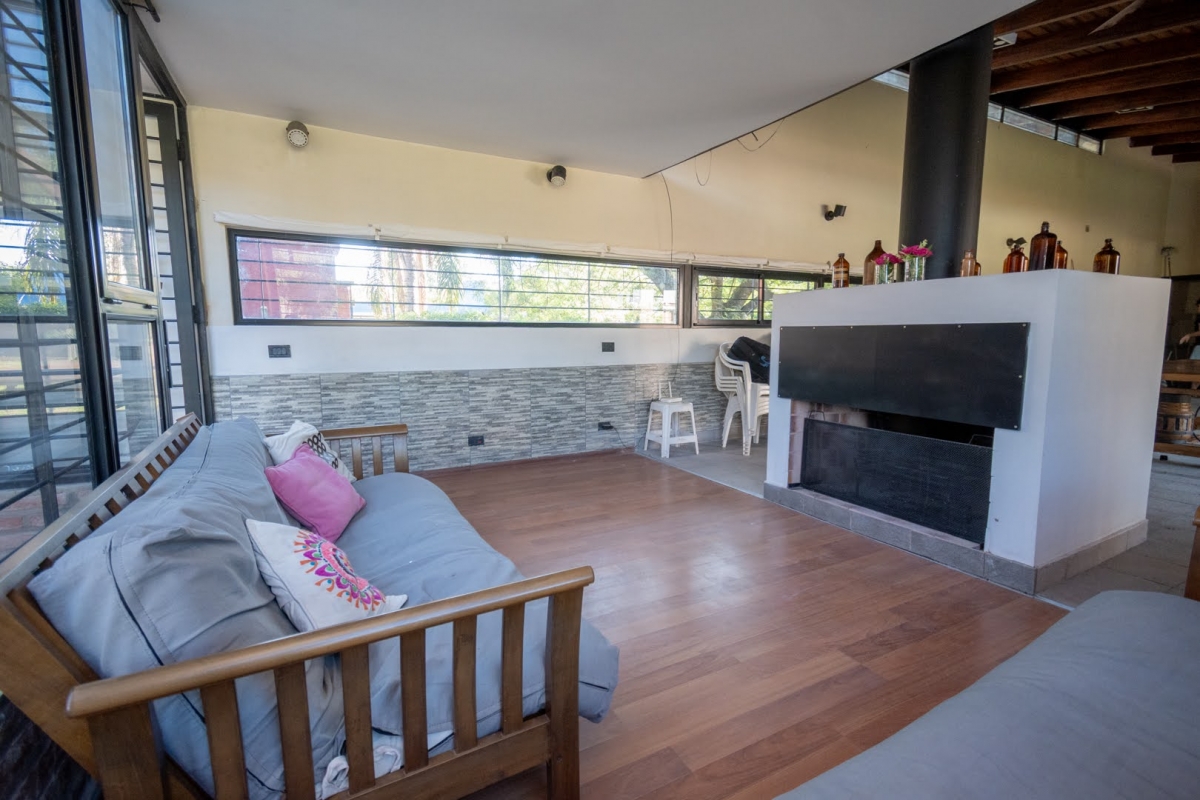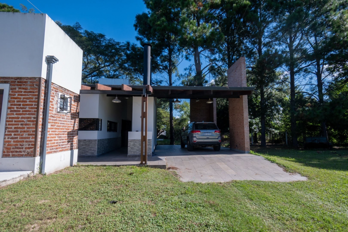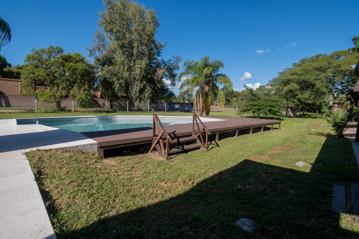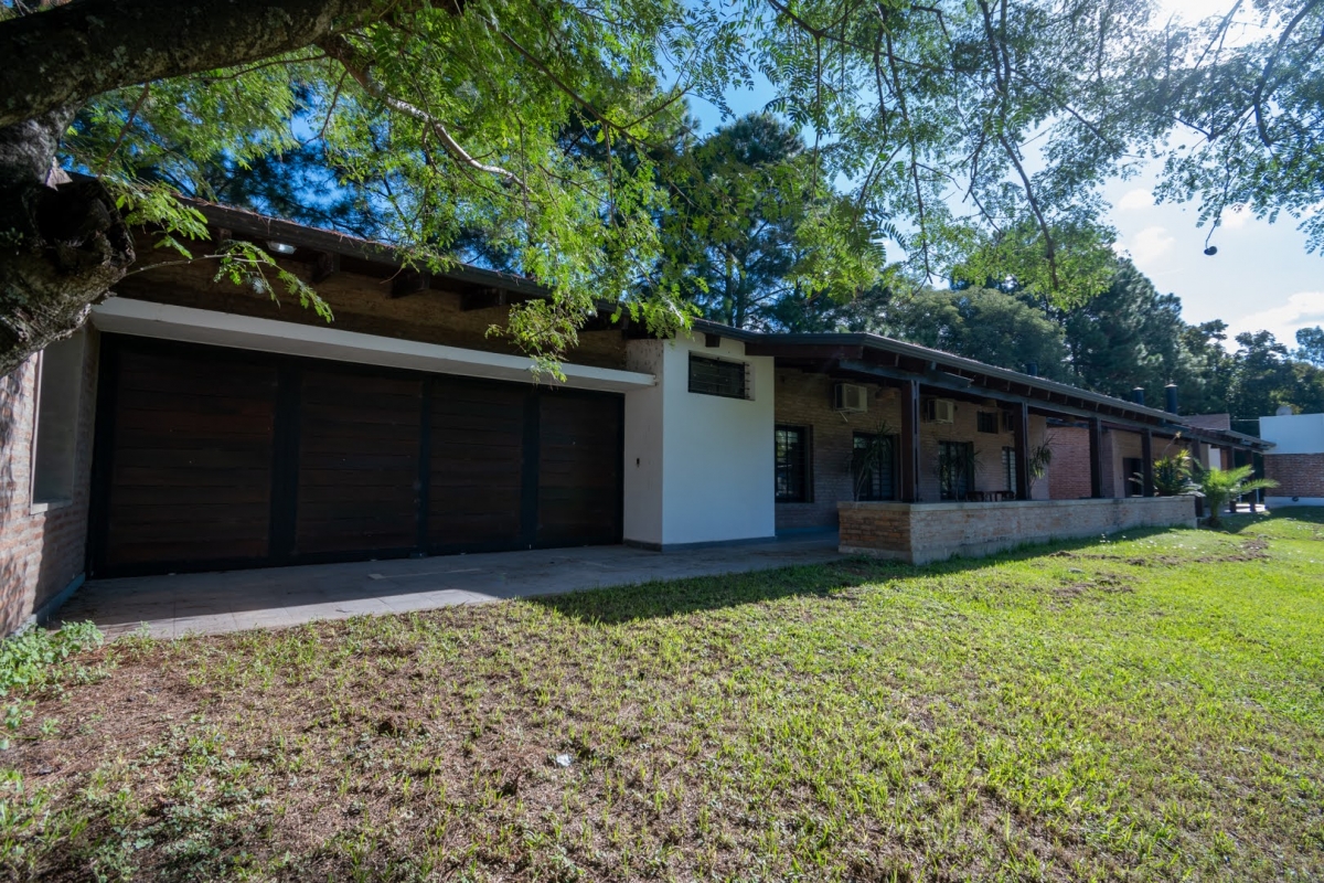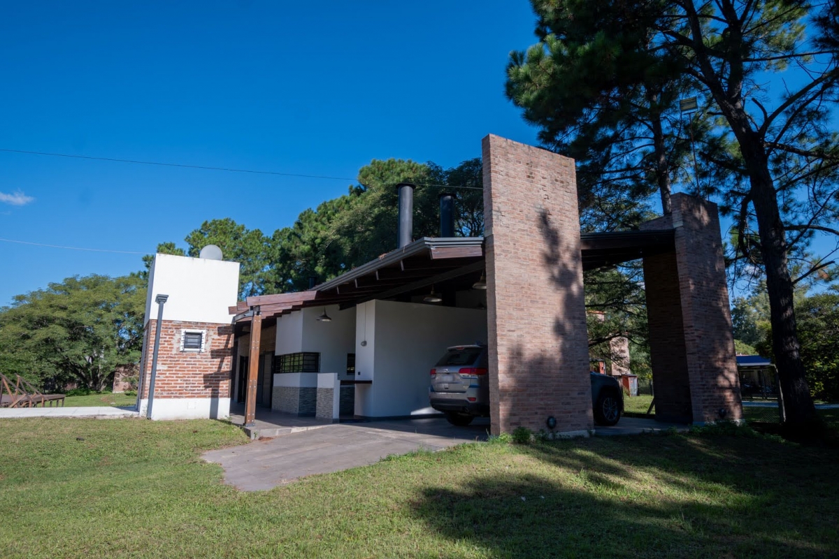 Ubicada en la intersección de Los Lapachos y Los Grillos, en Villa California, esta propiedad se encuentra a aproximadamente 500 metros de la Ruta 1, en el lado oeste. Implantada sobre cuatro lotes que conforman una superficie total de 3.212 m², se desarrolla íntegramente en planta baja, ofreciendo una distribución cómoda y funcional. El sector social se compone de un amplio living comedor, con cocina integrada mediante barra desayunadora. Todo el ambiente cuenta con grandes superficies vidriadas que generan una conexión directa con la galería y el parque. En este sector también se dispone un baño. En un ala independiente, se encuentra el área privada, a la que se accede mediante un pasillo distribuidor. Allí se ubican tres dormitorios, destacándose el principal en suite con vestidor, además de un segundo baño completo. La propiedad también cuenta con lavadero y una cochera de generosas dimensiones, ideal tanto para vehículos como para embarcaciones. En el exterior, ofrece una galería con asador y espacio destinado a quincho, piscina revestida con deck y solárium, además de un baño exterior que aporta practicidad para el uso diario. CARACTERÍSTICAS ADICIONALES: Sistema de riego automático en sector de cancha de fútbol, con seis aspersores Tres perforaciones de agua, cada una con su correspondiente bomba centrífuga Dos tanques de agua independientes: uno abastece dormitorios y lavadero, y otro cocina y comedor, ambos con bombas Rowа que garantizan excelente presión Dos pozos negros independientes Doble sistema de alarma, sectorizado, con barrera perimetral Aberturas protegidas con rejas y tejido metálico Se destaca por su sólida calidad constructiva y equipamiento de categoría. Lista para transferir. Se evalúa la posibilidad de recibir propiedades como parte de pago.
