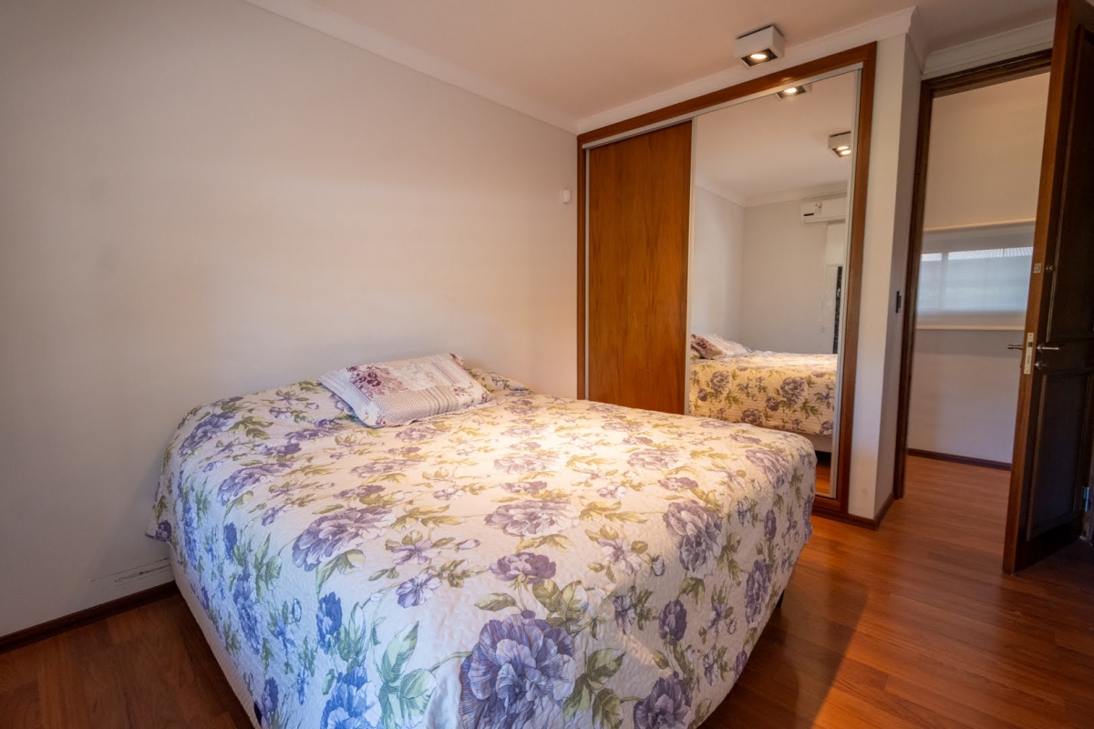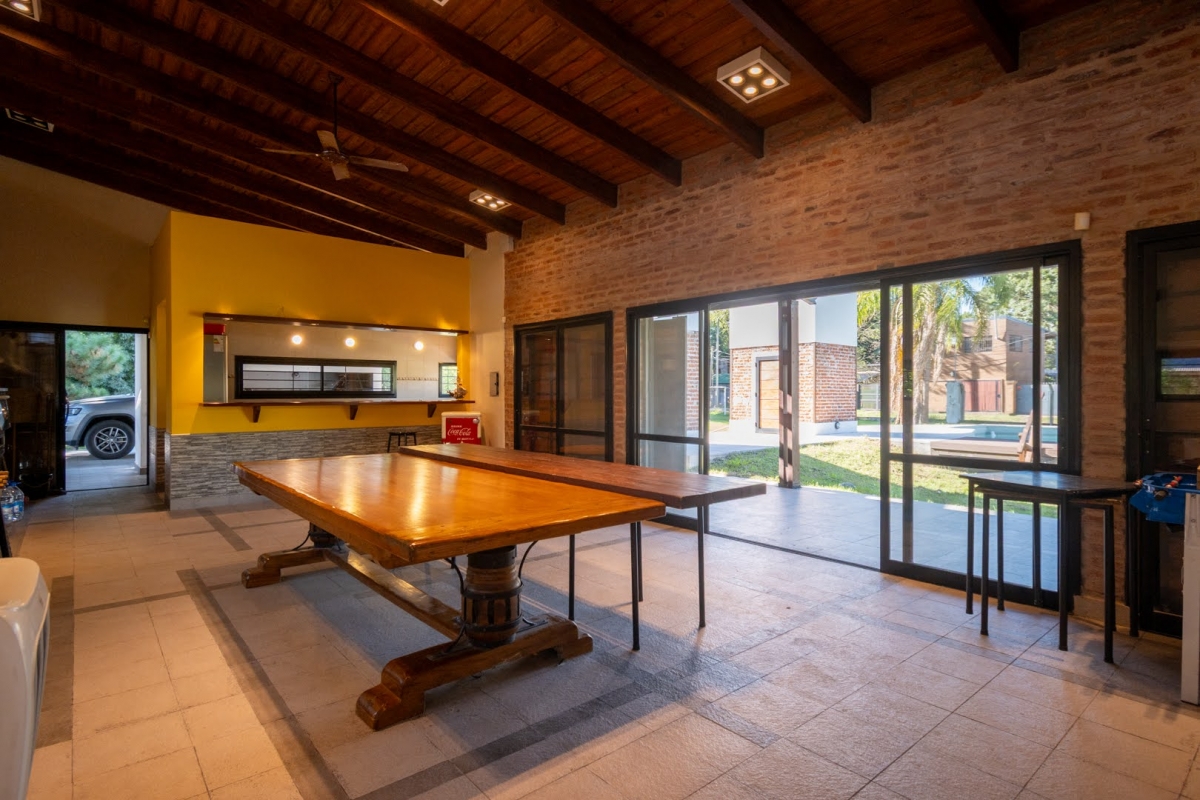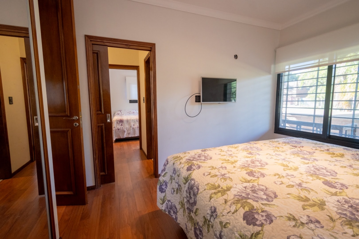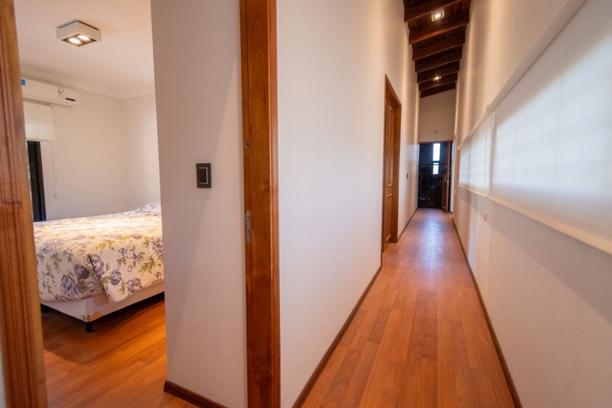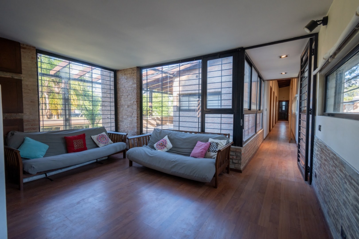 Ubicada en la intersección de Los Lapachos y Los Grillos, en Villa California, esta propiedad se encuentra a aproximadamente 500 metros de la Ruta 1, en el lado oeste. Implantada sobre cuatro lotes que conforman una superficie total de 3.212 m², se desarrolla íntegramente en planta baja, ofreciendo una distribución cómoda y funcional. El sector social se compone de un amplio living comedor, con cocina integrada mediante barra desayunadora. Todo el ambiente cuenta con grandes superficies vidriadas que generan una conexión directa con la galería y el parque. En este sector también se dispone un baño. En un ala independiente, se encuentra el área privada, a la que se accede mediante un pasillo distribuidor. Allí se ubican tres dormitorios, destacándose el principal en suite con vestidor, además de un segundo baño completo. La propiedad también cuenta con lavadero y una cochera de generosas dimensiones, ideal tanto para vehículos como para embarcaciones. En el exterior, ofrece una galería con asador y espacio destinado a quincho, piscina revestida con deck y solárium, además de un baño exterior que aporta practicidad para el uso diario. CARACTERÍSTICAS ADICIONALES: Sistema de riego automático en sector de cancha de fútbol, con seis aspersores Tres perforaciones de agua, cada una con su correspondiente bomba centrífuga Dos tanques de agua independientes: uno abastece dormitorios y lavadero, y otro cocina y comedor, ambos con bombas Rowа que garantizan excelente presión Dos pozos negros independientes Doble sistema de alarma, sectorizado, con barrera perimetral Aberturas protegidas con rejas y tejido metálico Se destaca por su sólida calidad constructiva y equipamiento de categoría. Lista para transferir. Se evalúa la posibilidad de recibir propiedades como parte de pago.